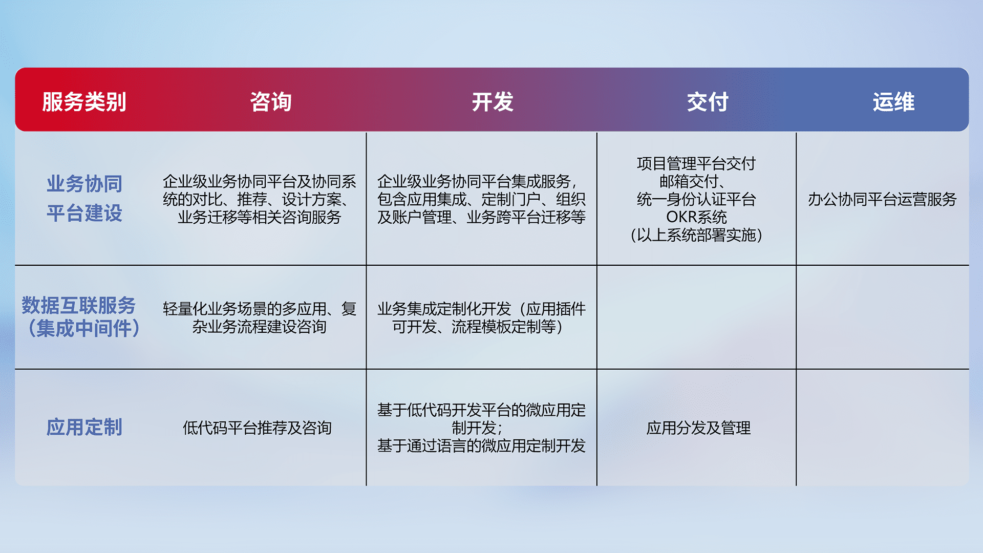 针对钉钉、、、企微、、、IDaas等平台级产品提供产品的规划、、方案、、、、交付、、、定制化开发等服务,,,实现如统一协同办公、、、智能客户服务、、、、混合会议管理、、、智能数据查询、、、等业务场景,,,,实现数字化转型。。。。